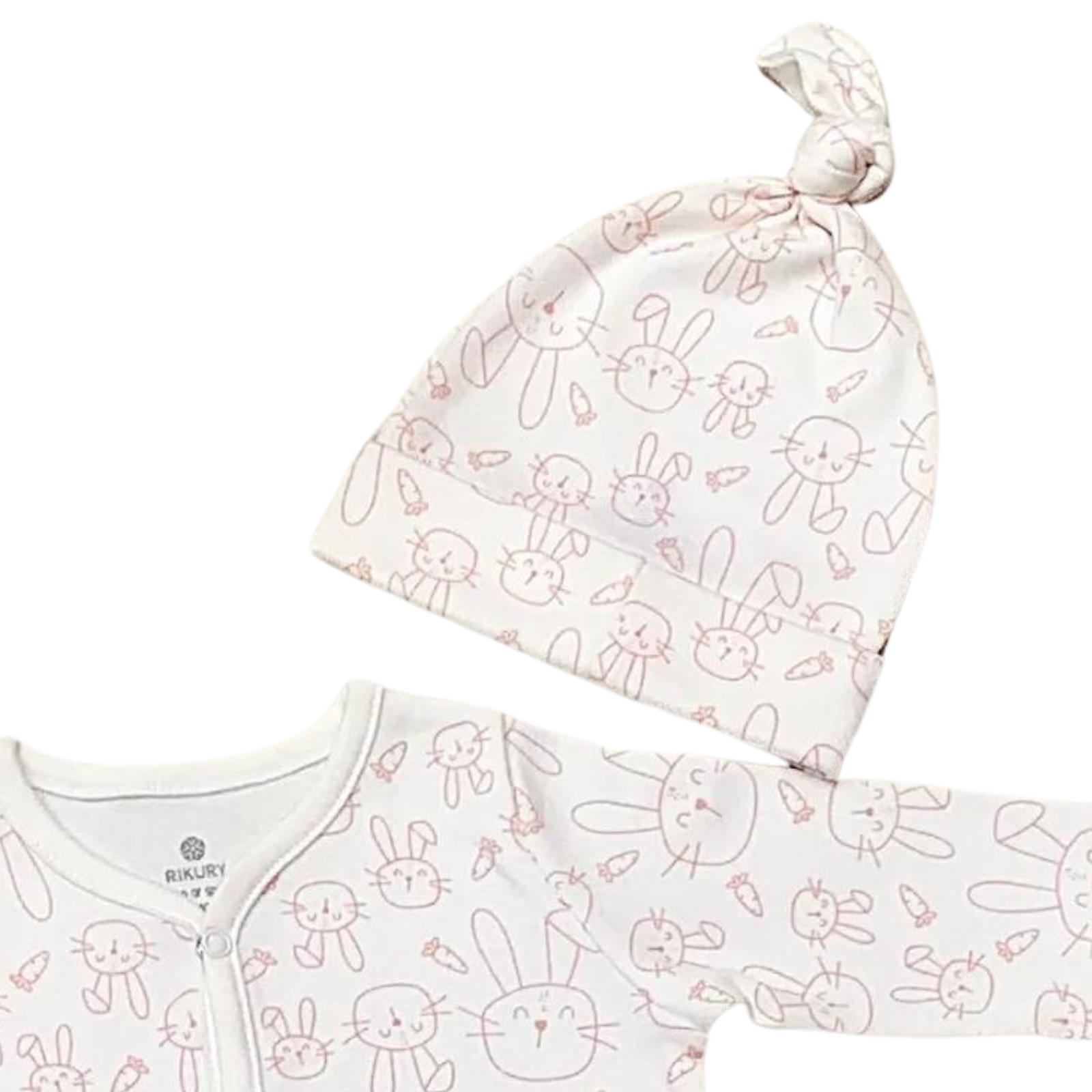 Gorrito con estampado de conejitos rosados 100% de algodón pima.